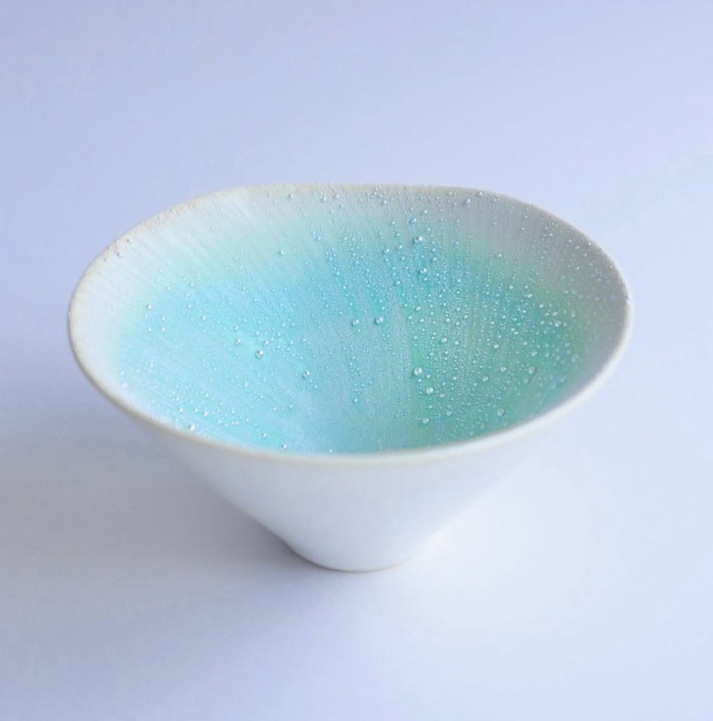 銀の粒は30年前に熔接のガスバーナーで釉薬を熔かして作品制作をしているときに、釉薬が粒になったのをきっかけに研究を重ね制作しています。