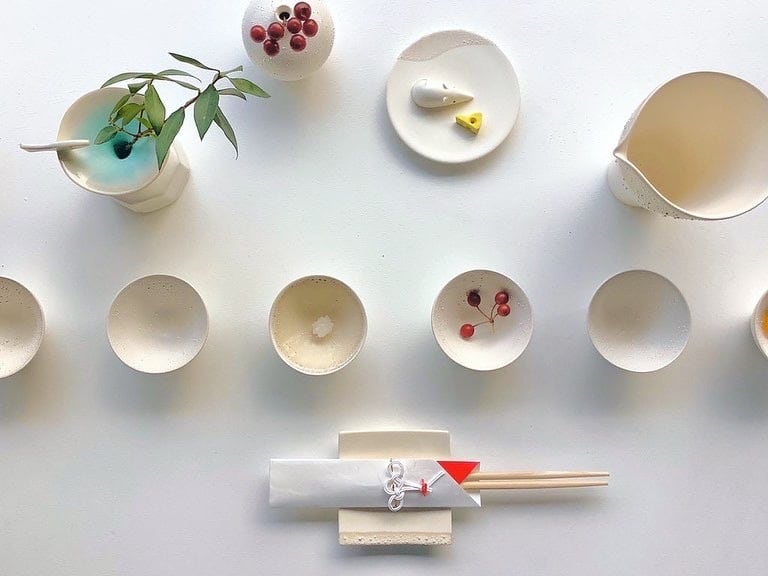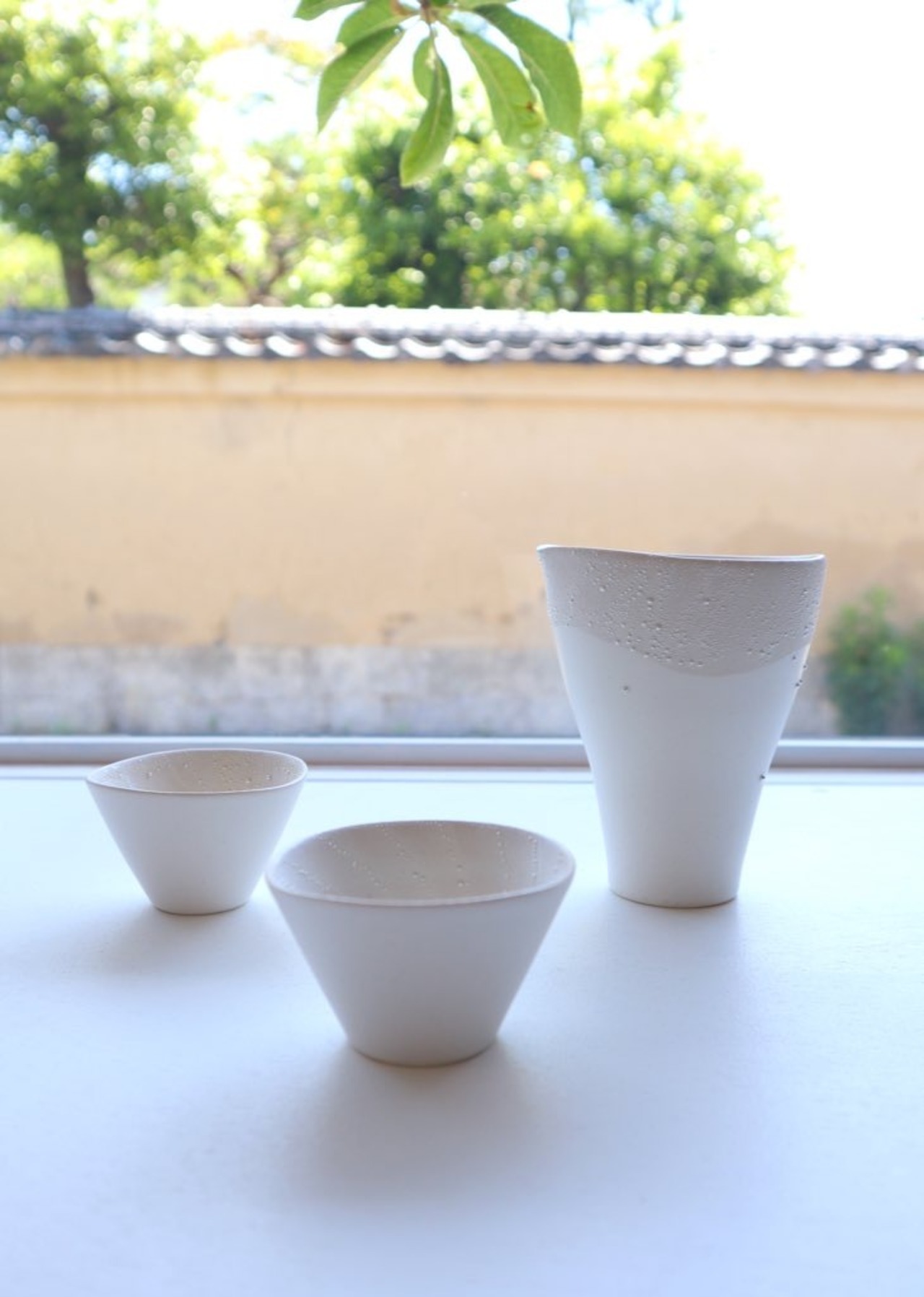 窯で焼くと粒が表れる釉薬です。25年前に熔接のガスバーナーで釉薬を熔かす作品をつくっていた時に釉薬が粒になり、自然にできる形の美しさをうつわに熔かしこめればと研究を重ねて制作しています。現在は窯で焼成しています。